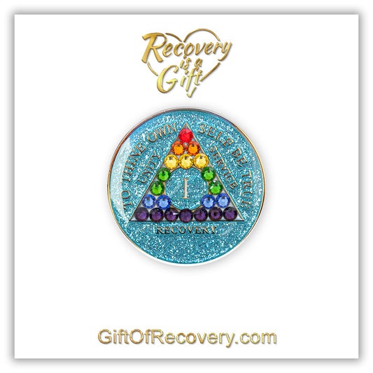 AA Recovery Medallion - Rainbow Crystallized Bling on Glitter Aqua