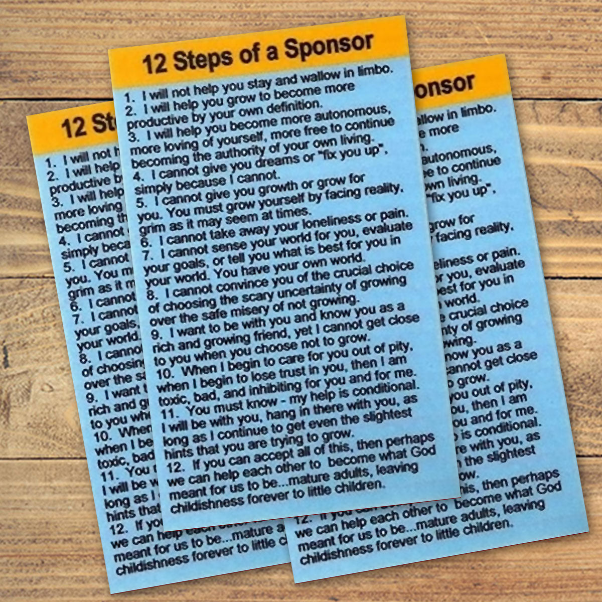 This 12 Steps of a Sponsor Wallet Card is an essential tool for sponsors and those in recovery alike, serving as a reminder of the boundaries, roles, and purpose of a sponsor. Crafted to fit easily in a wallet, this card provides clear guidance on supporting others through the journey of recovery while emphasizing self-responsibility and personal growth. Card is 2" x 3".