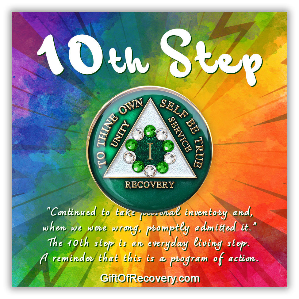 Our stunning 10th step medallions offer a reminder that this is a program of action. The 10th step is an everyday living step. Continued to take personal inventory and, when we were wrong, promptly admitted it.” The 10 alternating colors represent pausing and looking within for our part in each day's events.