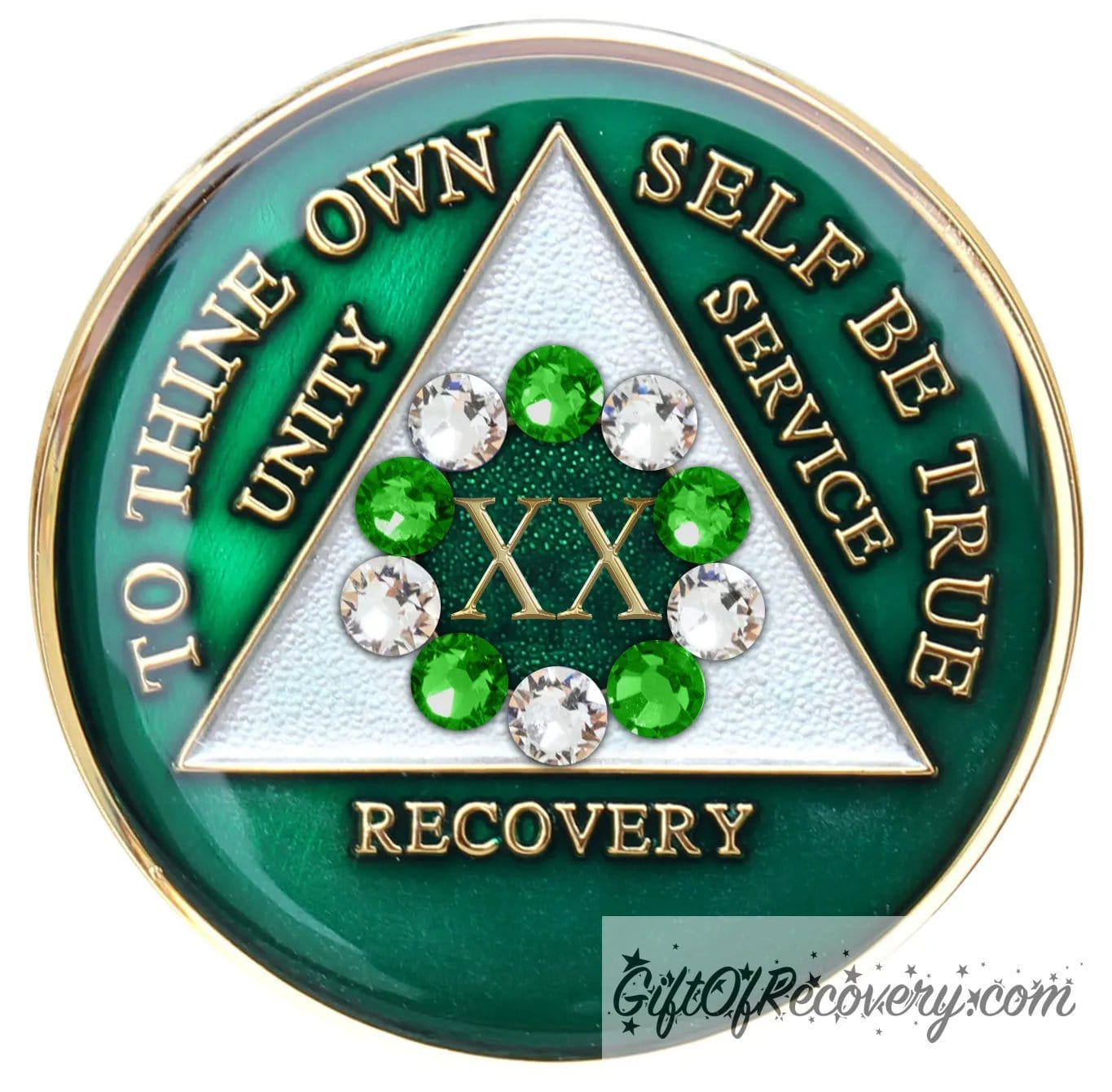 This commemorative sobriety medallion has a beautiful glossy finish, entirely hand-painted, green on the front, and black on the back, with the circle and triangle AA (Alcoholics Anonymous) symbol on both sides in embossed 14k gold-plated brass. It features a handcrafted (see below) green and diamond genuine crystal circle on the front, inside the AA symbol triangle, and a single green genuine crystal on the back at the center of the chip.