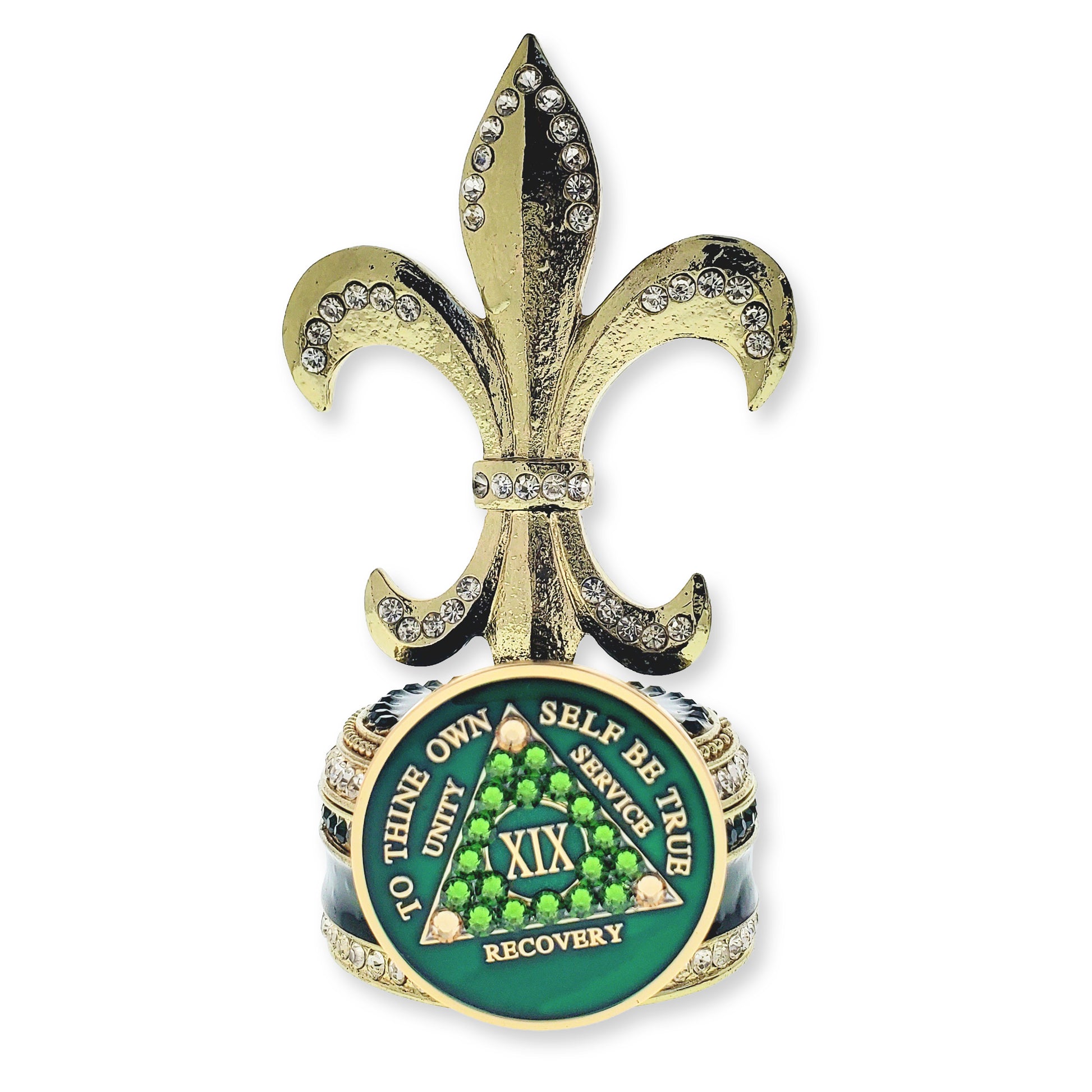 An absolutely stunning purple enameled Fleur de Lis-topped trinket box with hand-set Swarovski crystals and gold-plated trim. The trinket box is paired with a gorgeous green and gold crystallized sobriety coin. Perfect for those who enjoy a touch of class.