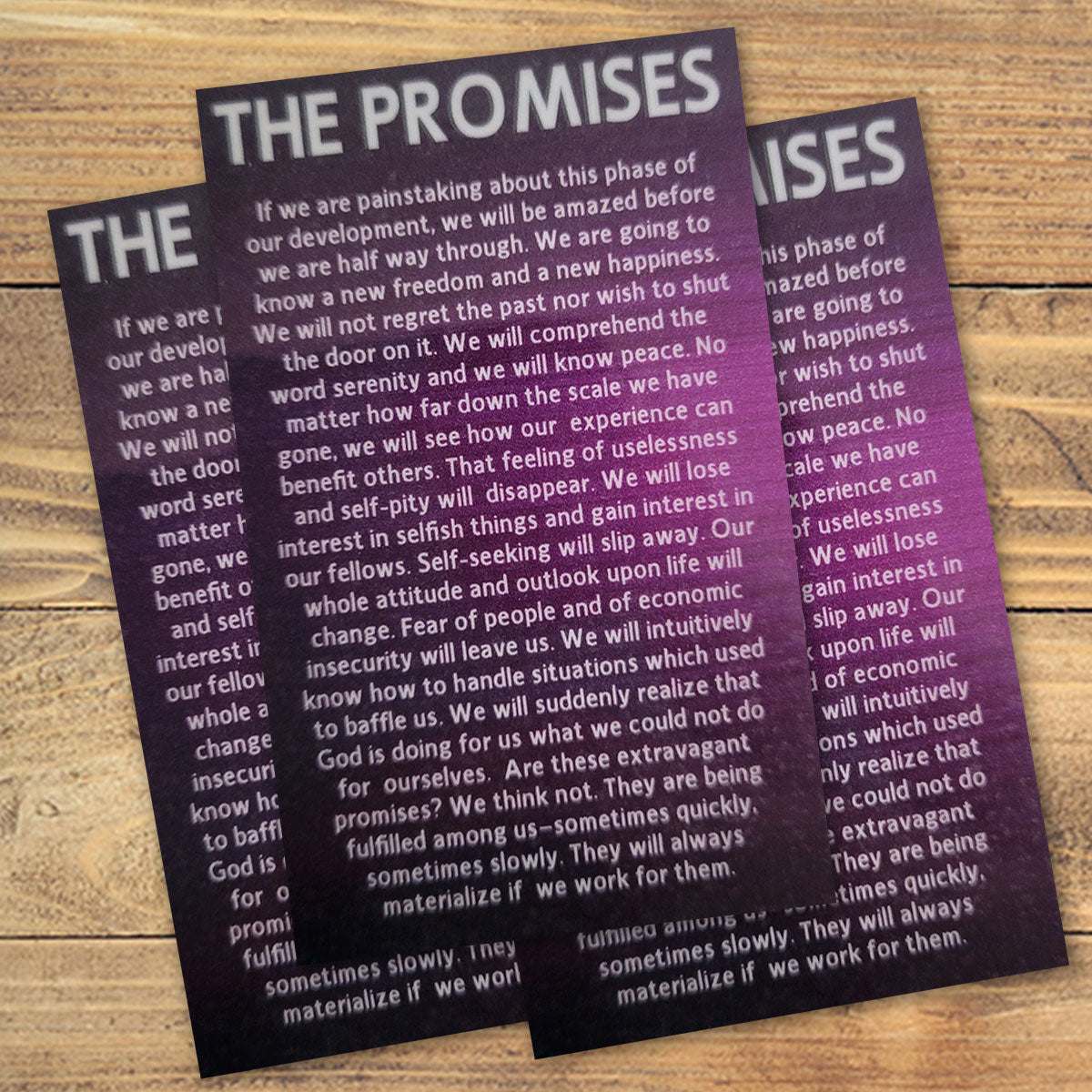 Carry the uplifting message of "The Promises" with you on this beautifully crafted wallet card, designed to fit in your pocket or wallet for easy access for encouragement and hope throughout the day. This card reflects the essence of recovery, detailing the promises of peace, clarity, and joy that come from progressing through a 12-step journey. Perfect for personal inspiration or as a gift for someone in recovery, it serves as a reminder of the serenity and freedom found in a life aligned with personal growth. Card is 2" x 3".